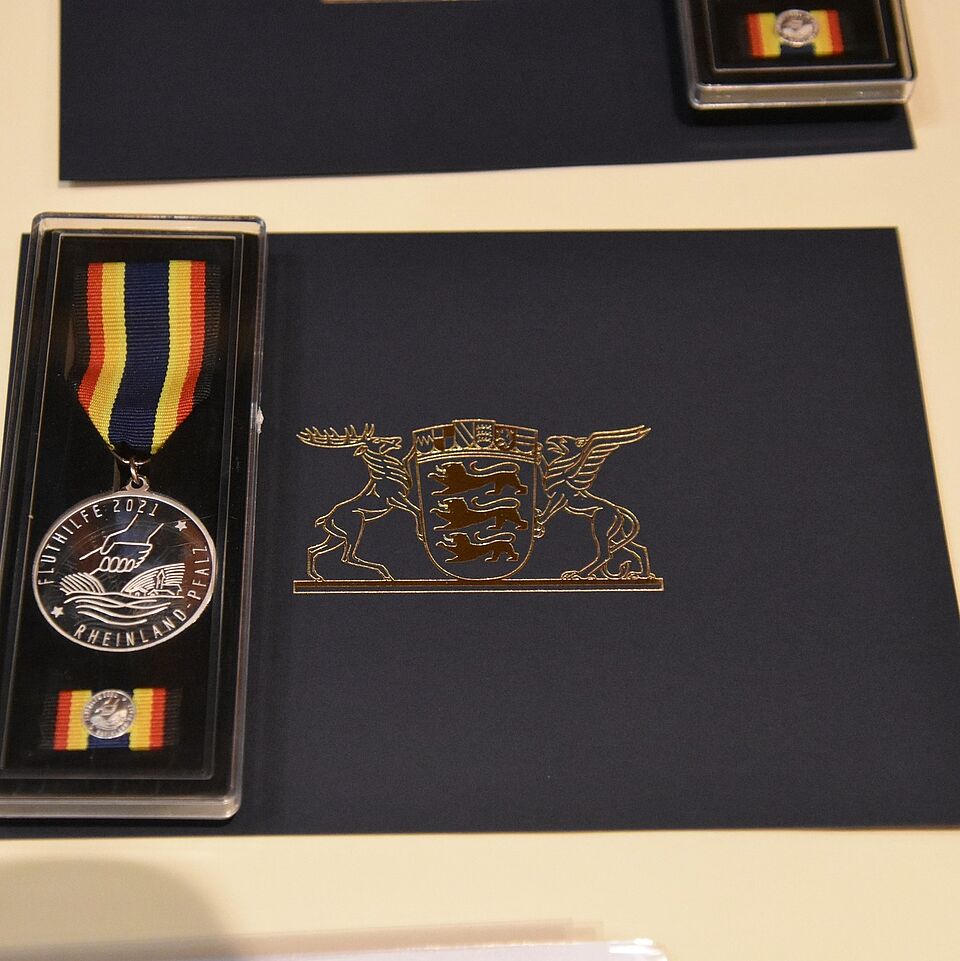 Verleihungsurkunde und Fluthilfemedaille des Landes Rheinland-Pfalz
