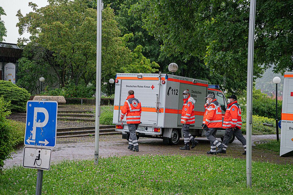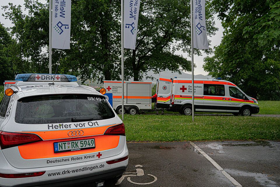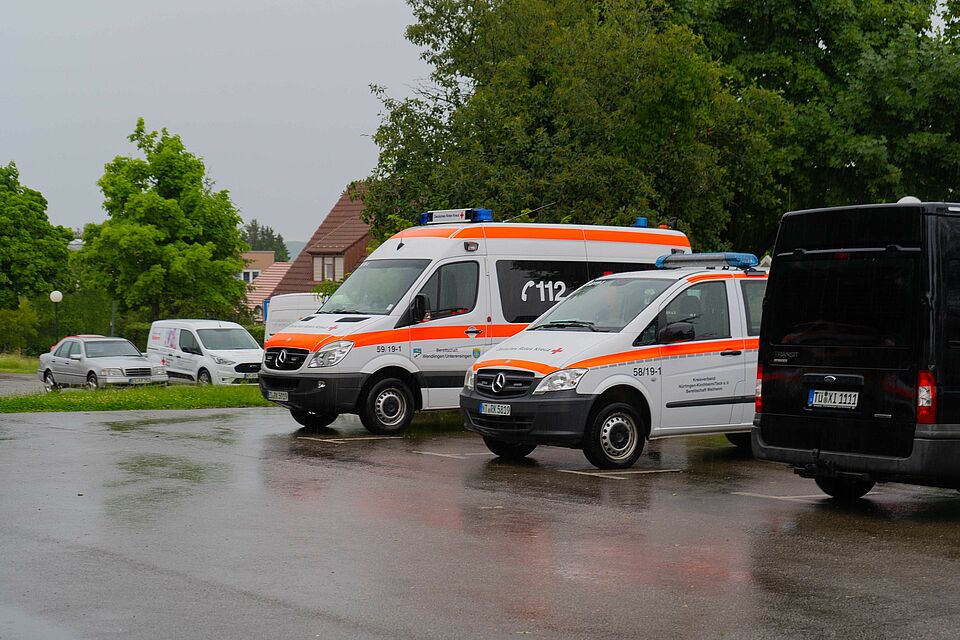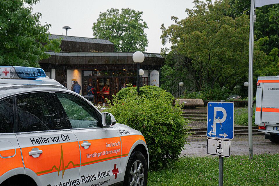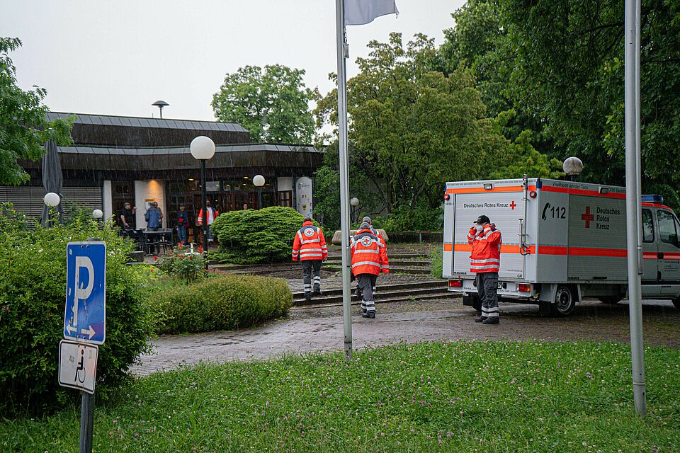Heute (05.06.2022) morgen um 7:51 Uhr wurde die SEG Teck durch die Integrierte Leitstelle Esslingen nach Weilheim zur Räumung eines Open Air Festivals alarmiert. Das Open Air Festival "Kult-Ur Open-Air", welches schon viele Jahre zwischen Weilheim und Neidlingen stattfindet, musste durch das in den frühen Morgenstunden auftretende Unwetter vollständig geräumt werden. Um ca. 8:20 Uhr trafen alle alarmierten Kräfte der DRK Bereitschaften Kirchheim, Weilheim sowie Wendlingen mit insgesamt 22 Einsatzkräften und 9 Fahrzeugen ein und begannen mit der Räumung, sowie mit der Einrichtung der Betreuungsstelle. Die ca. 70 Festivalgäste wurde mit Mannschaftstransportwägen nach Weilheim in die Limburghalle verbracht, diese war im Vorhinein bereits als Evakuierungsziel erkundet worden und stand hierfür bereit. Vor Ort wurden alle Personen mit Decken sowie Warm- und Kaltgetränken versorgt und betreut.