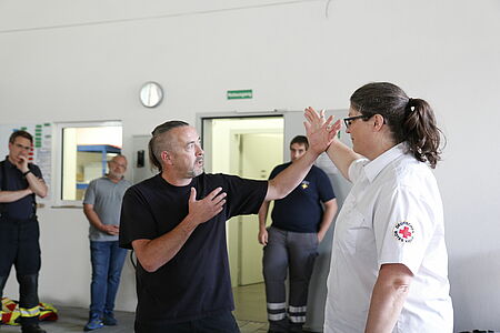 Einsatzkräfte des Deutschen Roten Kreuzes Nürtingen-Kirchheim/Teck lernen, wie man im Einsatz mit Übergriffen und Gewalt umgeht.